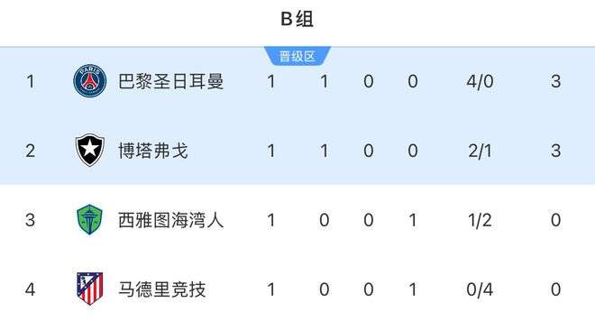 第一輪踢完,巴黎大炒對手排喺榜首,保地花高攞到3分排第二,西雅圖海灣者排第三,馬德里體育會就包尾。