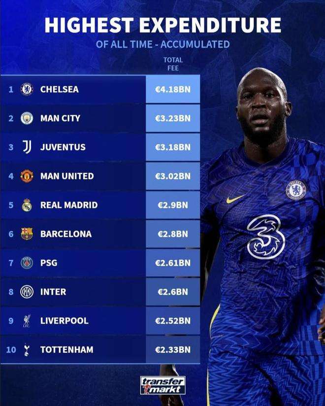 根據《德國轉會市場網》(Transfermarkt)最新統計,世界足壇歷史轉會費支出榜上,英超勁旅切爾西以高達41.8億歐元的總投入位列榜首,遠超其餘對手。這一數字也正式反映出自阿布入主後至今,切爾西對轉會市場的極度依賴。