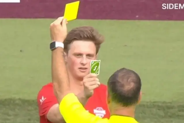 近日英國舉辦一場慈善足球賽,一名選手吃了黃牌後,竟一臉正經地對裁判拿出「Uno迴轉卡」,現場球迷歡聲雷動,也在網路社群引發話題,連UNO官方帳號都來朝聖。而該相片亦於網路上瘋傳,風頭一時無兩。