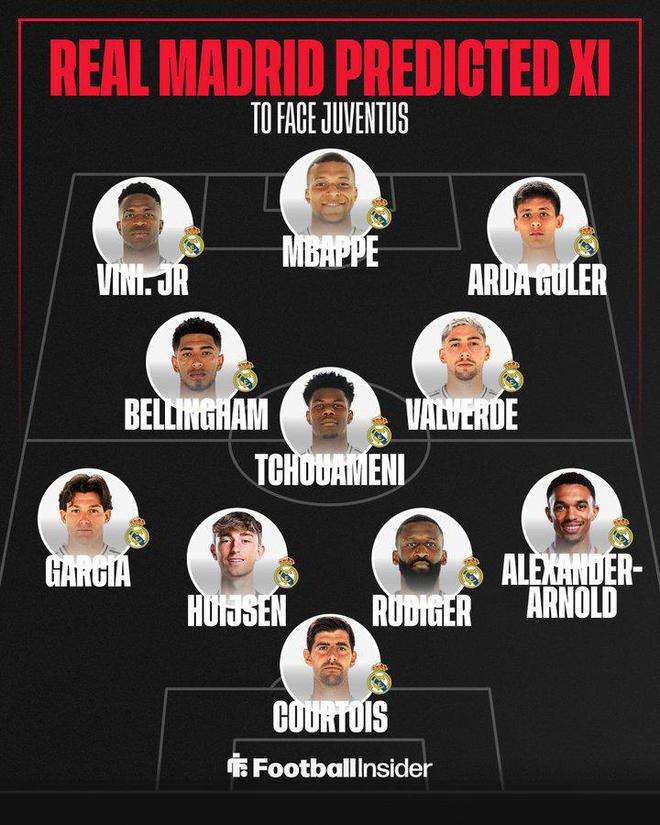 具體名單如下(4-3-3):門將:庫爾圖瓦;後衛:加西亞、赫伊森、呂迪格、阿諾德;中場:貝林厄姆、楚阿梅尼、巴爾韋德;邊鋒:維尼修斯、居萊爾;中鋒:姆巴佩。