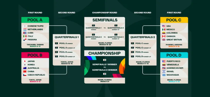 | A組 | 3月8日 ~3月13日 | 台灣台中洲際棒球場 | 台灣、荷蘭、古巴、義大利、巴拿馬 |