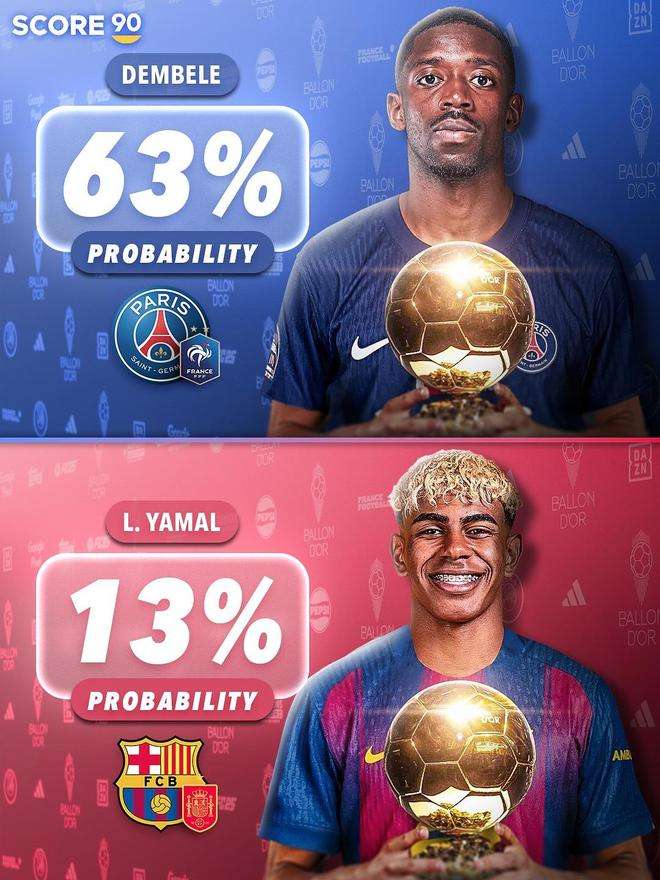 距離2025年金球獎正式揭曉尚有數月時間,但各大媒體已紛紛根據過去一年球員表現、榮譽成就與球隊戰績進行預測。根據外媒《SCORE 90》最新更新的金球獎得主概率排行,巴黎聖日耳門的登貝萊以63%的高機率遙遙領先,緊隨其後的是西班牙新星亞馬爾(13%),而巴黎的另一位中場維蒂尼亞則排名第三(6%)。
