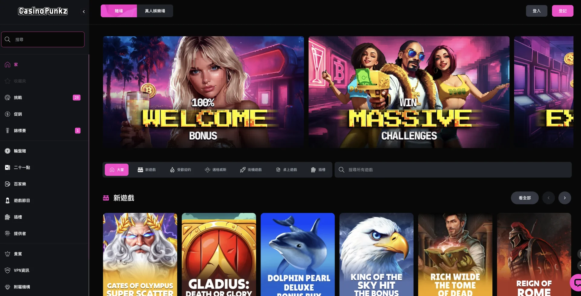 CasinoPunkz線上賭場提供廣泛多元的娛樂選擇,涵蓋經典賭場遊戲和創新主題遊戲,內容如下: