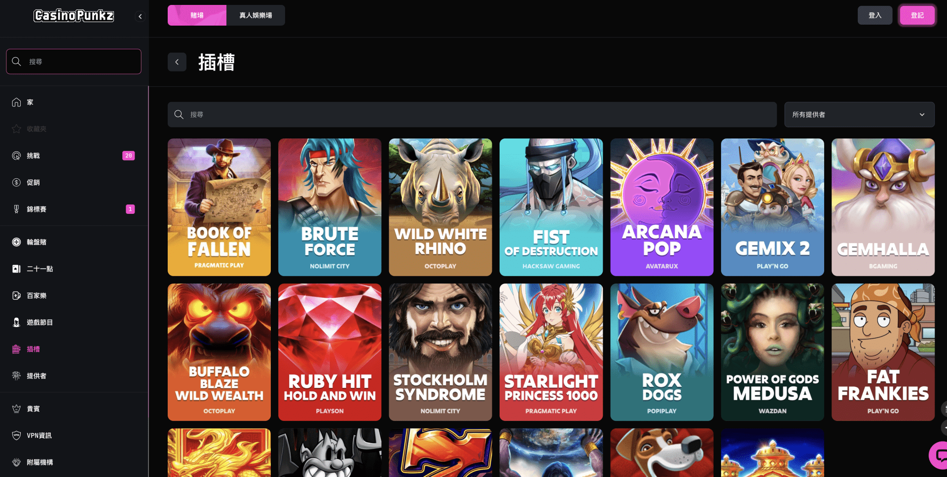 CasinoPunkz的拉霸機遊戲全數與國際大廠合作,如Microgaming, NetEnt, Play’n GO等。收錄主題逾千款,分成經典拉霸、3D視覺特效、巨獎累積池等類型,並設「免費試玩」及「高波動獎金」分類,方便玩家快速尋找心儀機台。