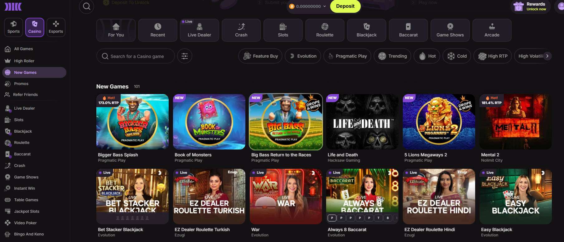 - 老虎機: 超過 3000 款遊戲,主題豐富,支援 Megaways、買功能與累積彩金。