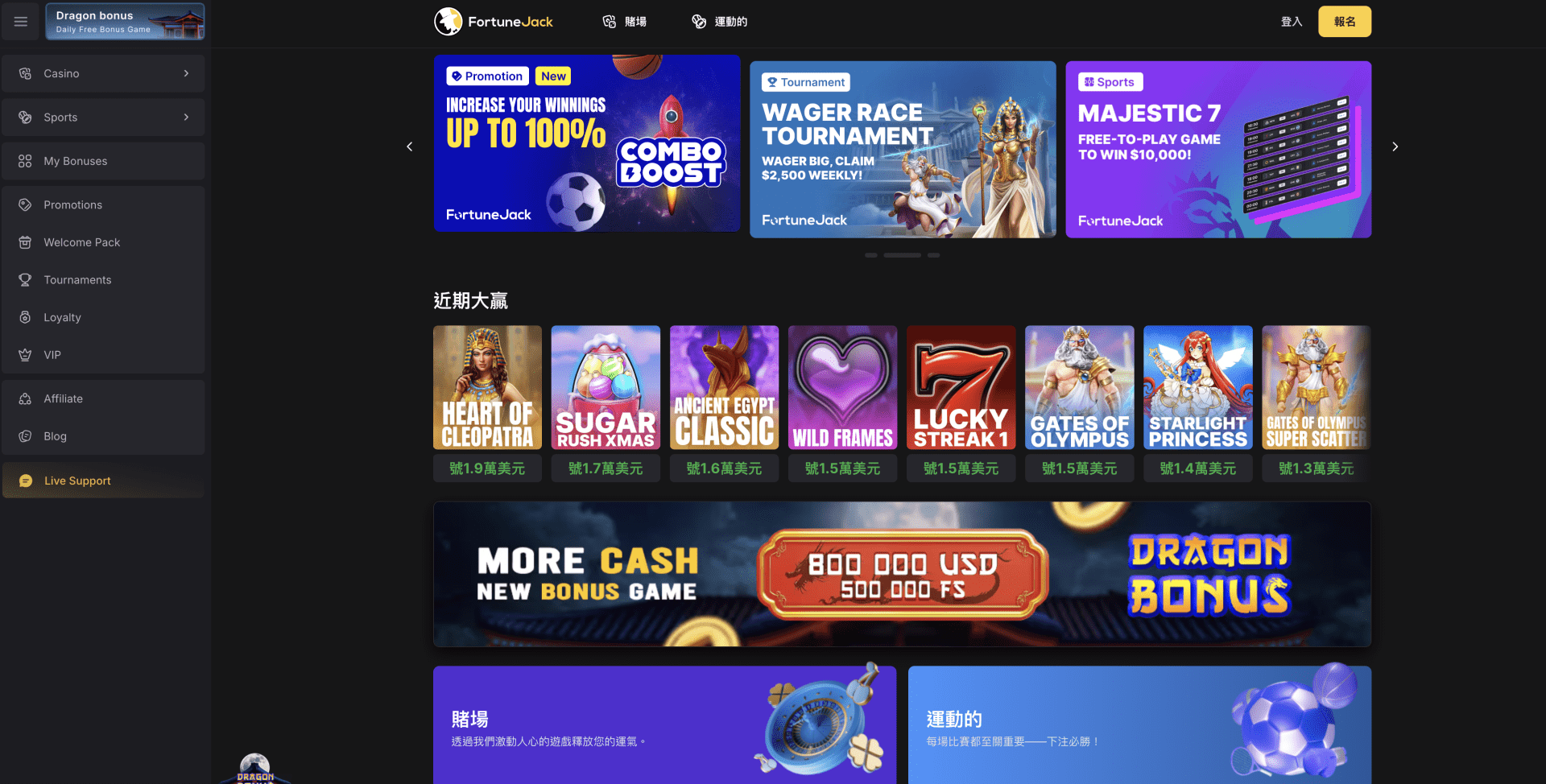 FortuneJack在線賭場體育博彩區涵蓋全球各大聯賽,包括足球、籃球、網球、美式足球、棒球甚至高爾夫、賽車等冷門項目。電子競技愛好者也可針對熱門賽事如LOL、DOTA2、CS:GO進行投注,支援賽前與滾球即時賭盤,賠率公平、賽事庫存豐富,滿足多元玩家投注樂趣。
