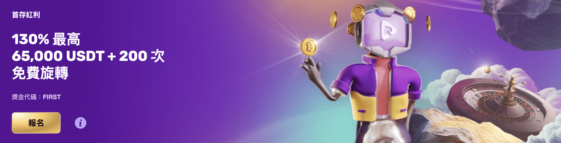 新用戶註冊並完成首次充值後,可獲得百分比獎勵。例如,玩家首次存入的比特幣可以獲得 100% 額外紅利,紅利金額上限視活動而定。